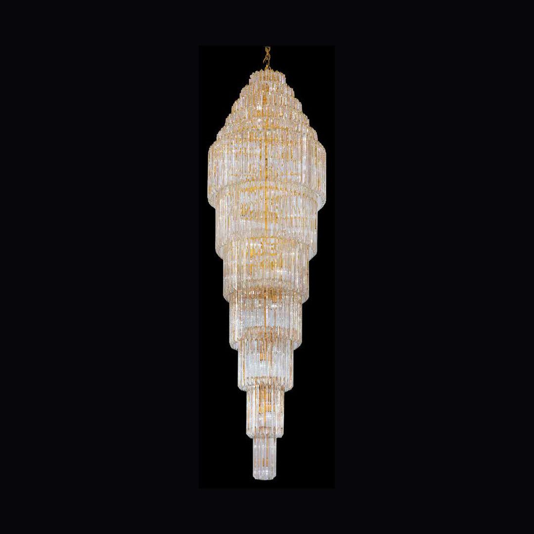 Majesté Céleste Ce chef-d'œuvre en cristal pur descend avec grâce dans un mouvement pyramidal spectaculaire. Sa silhouette élancée et étagée capte la lumière pour créer un effet magique et théâtral.